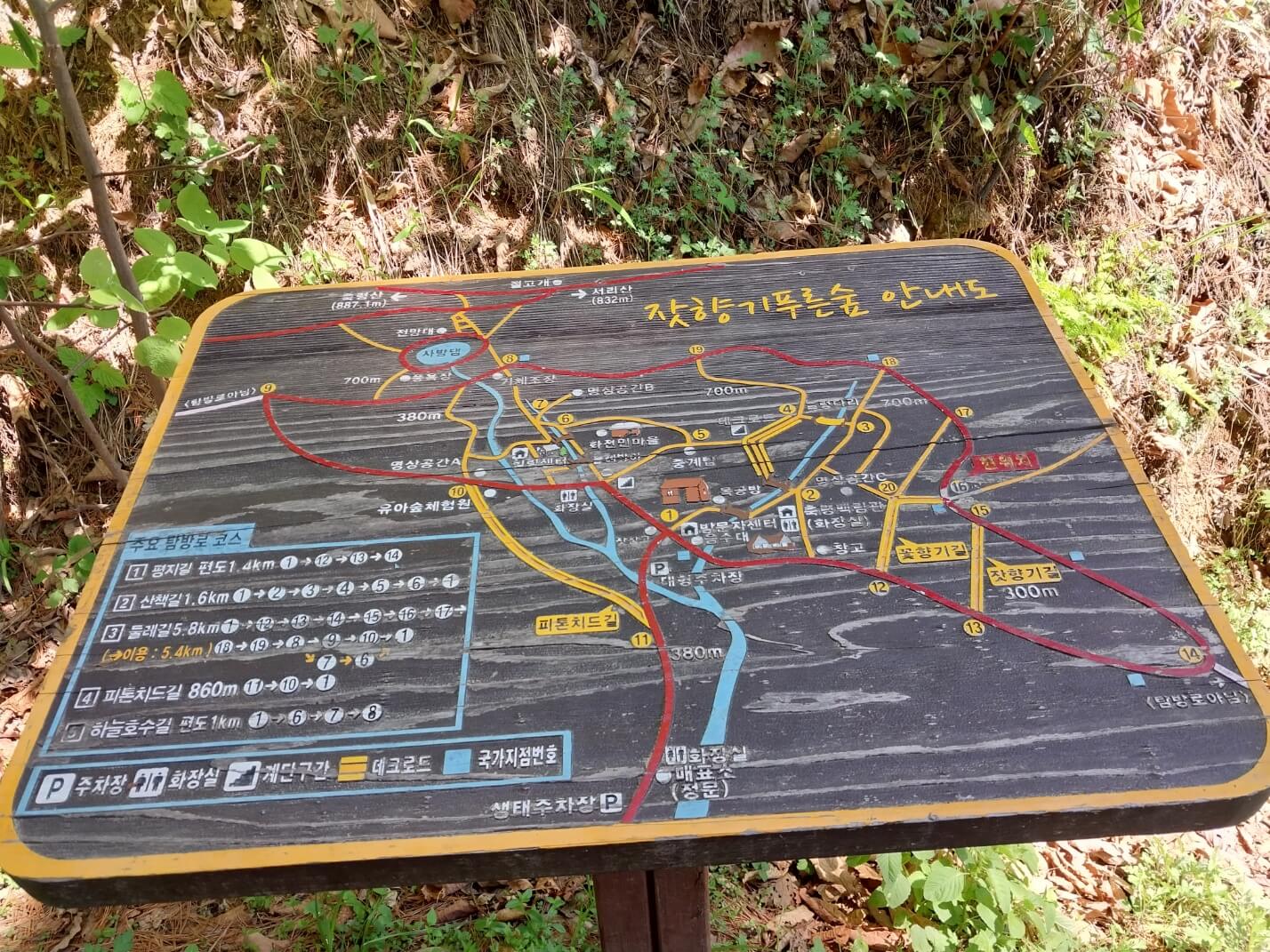 피톤치드길 860m, 하늘호수길 편도 1 km 로 되어있습니다. 남편과는 걷기를 둘다 좋아해서 둘레길코스를 선택하고 2시간 30분정도 오랫만에 깨끗한 공기를 실컷 마신것 같습니다.